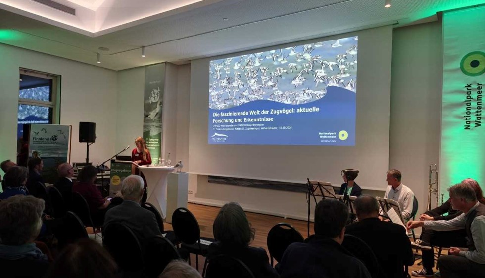 From October 11 to 19, 2025, the 17th Zugvogeltage took place in Wilhelmshaven at the Nationalpark Niedersächsisches Wattenmeer, featuring lectures, excursions, and workshops on migratory birds. Miriam contributed to the opening ceremony, while a member of her team, Corinna Langebrake, gave a presentation during the event, sharing current research on bird migration. The program brought together scientists, bird enthusiasts, and the public to explore and celebrate the remarkable journeys of migratory birds. (Image: Miriam Liedvogel)